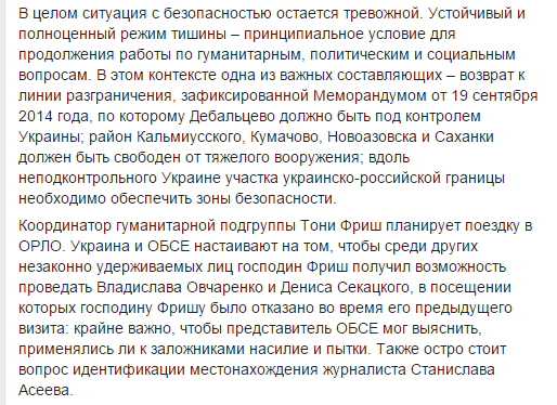По ее словам, с 22 сентября 2017 года 6 раз были обстреляны населенные пункты - Гранитное, Марьинка, Зайцево. 30 сентября 2017 года Специальная мониторинговая миссия (СММ) ОБСЕ зафиксировала обстрел в районе Станицы Луганской, что в очередной раз срывает выполнение рамочного решения Трехсторонней контактной группы о разведении сил и средств и ставит под угрозу выполнение Минских соглашений в целом.
