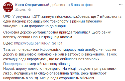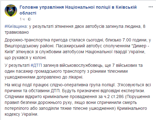 Отмечается, что автобус, следовавший по маршруту "Дымер - Киев", столкнулся с автобусом Нацгвардии, двигавшемся в составе автоколонны. В результате ДТП погиб один военнослужащий НГУ, еще семеро военных получили травмы. Также пострадал один человек в пассажирском автобусе.