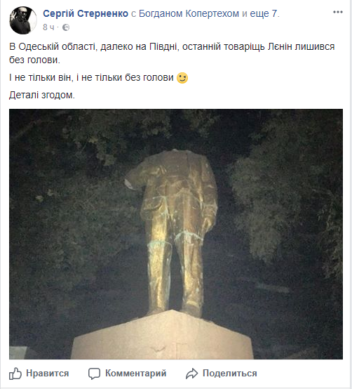 "В Одесской области, далеко на Юге, последний товарищ Ленин остался без головы. И не только он, и не только без головы;)", - написал Стерненко.