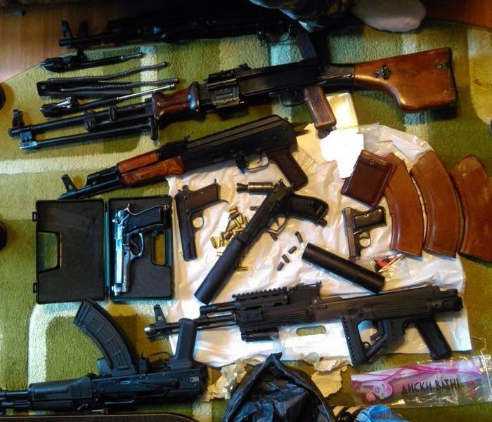 Во время одновременных обысков по месту жительства и временного пребывания членов группировки на территории Киевской и Запорожской областей оперативники спецслужбы изъяли ручной пулемет Калашникова, четыре автомата АКМС и АКС, двенадцать пистолетов различных марок, в том числе револьверы, два пистолета-пулемета, гранату РГД-5, карабин, глушитель, более 700 патронов различного калибра и большое количество составных частей к огнестрельному оружию.