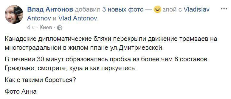 "Канадские дипломатические бляхи перекрыли движение трамваев на многострадальной в жилом плане ул. Дмитриевской. В течение 30 минут образовалась пробка из более чем 8 составов. Граждане, смотрите, куда и как паркуетесь", - пишет Антонов.