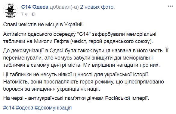 В Одессе осквернили мемориальные таблички в честь Героя СССР разведчика Николая Гефта, облив их краской. Об этом сообщается на Facebook странице одесской ячейки националистической организации "С14", которые взяли на себя это.