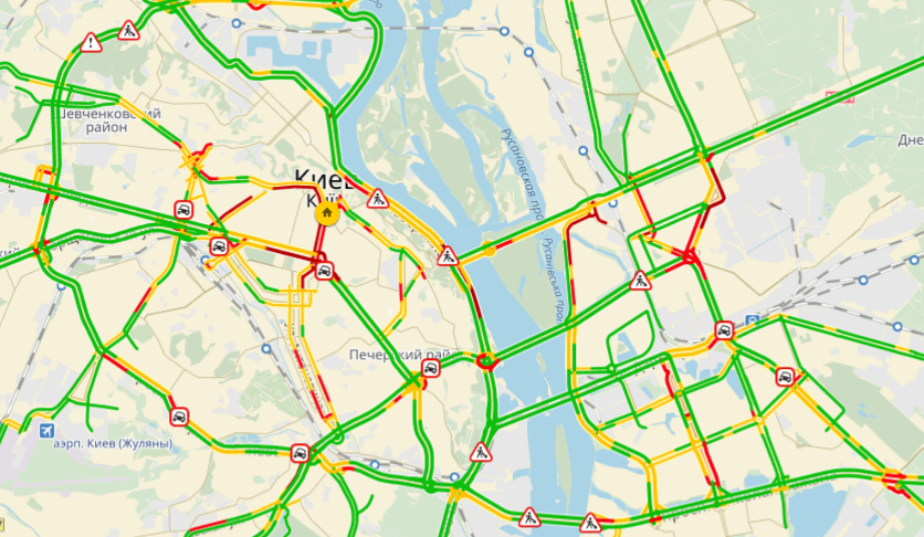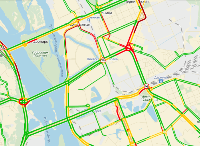 На Левобережье заторы сформировались в районе Дарницкой площади. Еще одна пробка тянется от ул. Гната Хоткевича по проспекту Юрия Гагарина до его пересечения с ул. Павла Усенко.