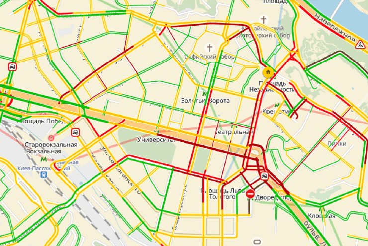 Дорожное движение на правом берегу Днепра в столице затруднено на бульваре Шевченко, улице Льва Толстого, Владимирской, Антоновича, Бассейной, Институтской и ряде других "традиционных" мест вечерних заторов.