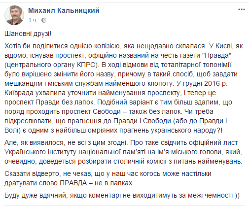 Писатель и краевед Михаил Кальницкий обратил внимание на официальное письмо Украинского института национальной памяти на имя городского головы,  о том, что Киевсовет должен переименовать"Проспект Правды".