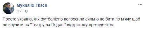 "Просто украинских футболистов попросили сильно не бить по мячу чтобы не попасть по "Театру на Подоле", открытому президентом", - выдвигает свою версию журналист Михаил Ткач.