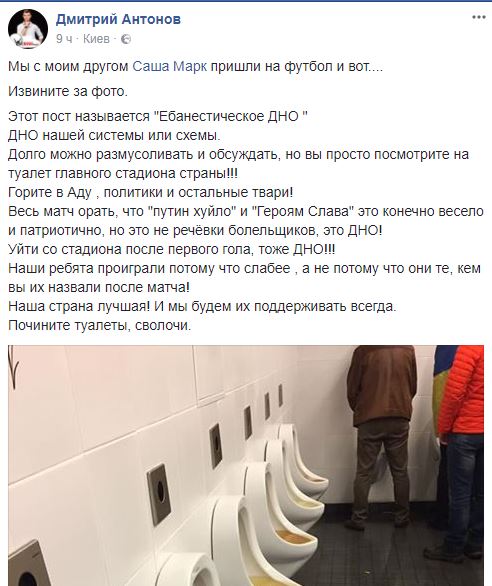 Ведущий из Миргорода Дмитрий Антонов раскритиковал состояние туалетов на НСК "Олимпийском", показав в Facebook неприглядную изнанку футбольного празднества.