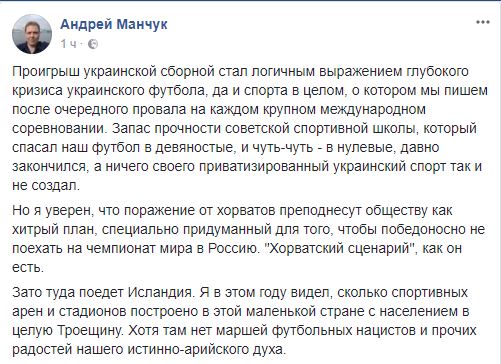 "Я уверен, что поражение от хорватов преподнесут обществу как хитрый план, специально придуманный для того, чтобы победоносно не поехать на чемпионат мира в Россию. "Хорватский сценарий", как он есть.