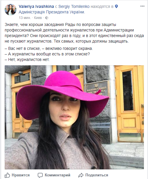 "Знаете, чем хороши заседания Рады по вопросам защиты профессиональной деятельности журналистов при Администрации президента? Они происходят раз в году, и в этот единственный раз сюда не пускают журналистов. Тех самых, которых должны защищать.