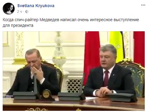 Евгений Мураев, депутат: " Вполне вероятно, что Эрдоган приехал в Киев специально чтобы выспаться. В Турции ведь политическая ситуация напряженная, приходится спать вполглаза. А у нас тут кто его тронет? Кроме того, можно спокойно начинать отдыхать даже на пресс-конференции, поскольку все, что скажет Порошенко, известно заранее. Возможно, его любимые пассажи про российскую оккупацию вообще уже признаны на международном уровне как лучший способ от бессонницы. Просто еще не придумали, как прослушивать украинского президента в терапевтических целях вне дипломатического протокола".