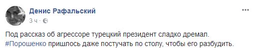Денис Рафальский, журналист: "Под рассказ об агрессоре турецкий президент сладко дремал. Порошенко пришлось даже постучать по столу, чтобы его разбудить".