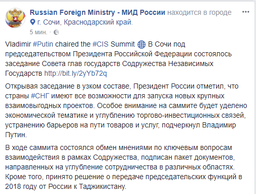 В Сочи под председательством президента России Владимира Путина состоялось заседание Совета глав государств Содружества Независимых Государств (СНГ). Об этом сообщает пресс-служба российского МИДа в Facebook.