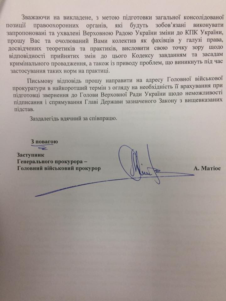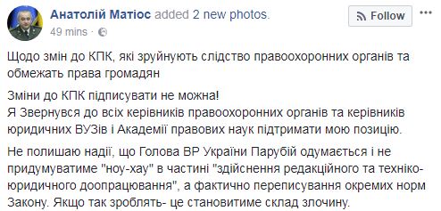 Изменения в УПК, которые разрушат следствие правоохранительных органов и ограничат права граждан, подписывать нельзя. Об этом написал главный военный прокурор Анатолий Матиос на своей странице в Facebook.