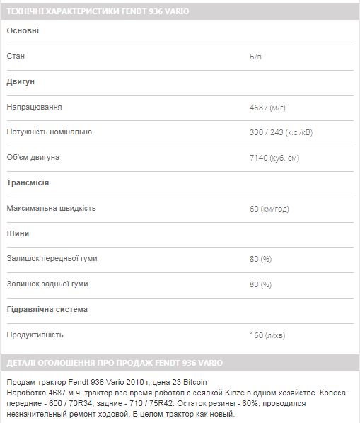 Модель Fendt 936 Vario 2010 года предлагают купить за 23 биткоина. По состоянию на 12 октября один биткоин можно приобрести за $4 732, а, следовательно, стоимость трактора составляет около $109 000.