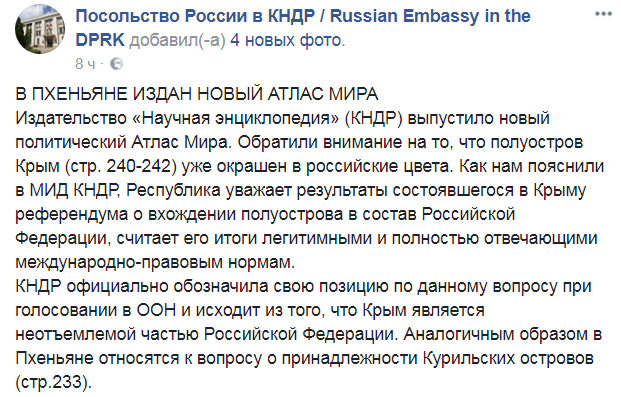 Северокорейское издательство "Научная энциклопедия" уже выпустило новый политический атлас мира, в котором аннексированный Крым окрашен в российские цвета.