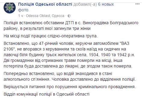 Как сообщили  в отделе коммуникаций Главного управления Национальной полиции в Одесской области, установлено, что 47-летний водитель автомобиля "ВАЗ 2106" не справился с управлением и совершил наезд на сидящих на скамейке возле жилого дома трех жительниц села. От сильного удара скамейка была разрушена, ограждение возле дома сбито на землю.