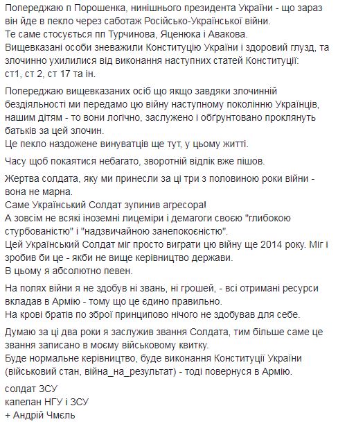 Кроме того Чмель пишет, что увольняется из рядов ВСУ. По его мнению, у солдат "украли победу", превратив их в "сторожевых собак, которых злой хозяин посадил на короткую цепь, надел намордник и даже связал ноги".