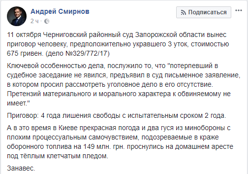 "А в это время в Киеве прекрасная погода и два гуся из минобороны с плохим процессуальным самочувствием, подозреваемые в краже оборонного топлива на 149 млн. грн. проснулись на домашнем аресте под теплым клетчатым пледом. Занавес", - комментирует Смирнов.
