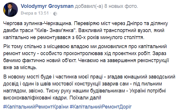 "В новом мосту будет и частица моего труда – вспомнил юношеский заводской опыт и один из швов мостовой конструкции сварил сам – под пристальным наблюдением, конечно". Однако не обошлось и без курьезов - в то время, как Гройсман решил помочь сварщику, у него "залип" электрод.