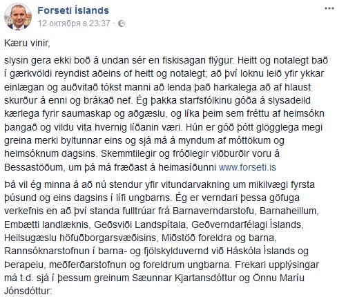 Президент Исландии Гвюдни Йоуханнессон сломал нос во время принятия ванны. Об этом сам пострадавший написал в своей странице в Facebook.