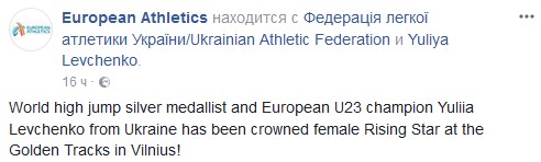 Украинская спортсменка Юлия Левченко стала победительницей в номинации "Восходящая звезда" в Европе по итогам 2017 года. Об этом сообщает пресс-слуба организаторов конкурса.