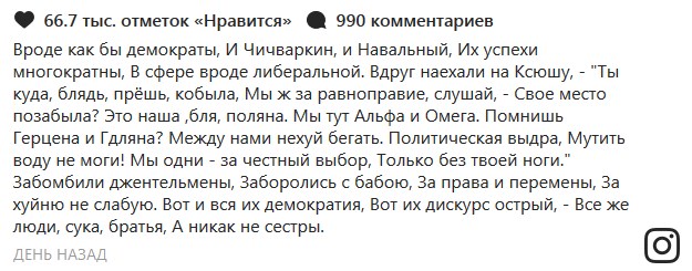 Текст стиха он опубликовал на своей странице в Instagram. Из него можно понять, что Шнур поддерживает выдвижение Собчак на пост президент и критикует тех, кто призывает Ксению не идти на выборы.