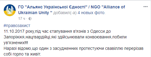 Правозащитники утверждают, что 11 октября во время этапирования заключенных из Одессы в Запорожье нацгвардейцы, которые осуществляли конвоирование, избили заключенных.