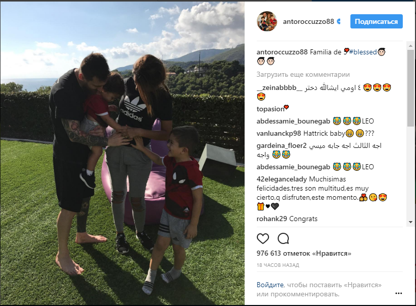Возлюбленная одного из лучших игроков в истории разместила фото, на котором Месси и их сыновья Тьяго и Матео касаются ее живота. И подписала снимок: "Семья из пяти человек".