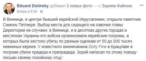 "В Виннице, в центре бывшей еврейской Иерусалимки, открыли памятник Симону Петлюре. Выбор места для сидящего на лавочке главы Директории не случаен: в Виннице, и в десятках других городах и местечках Украины его войска организовали еврейские погромы, в которых были жестоко убиты по разным оценкам от 50 до 200 тысяч невинных евреев", - написал он в Facebook.