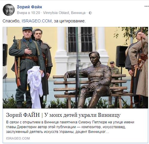 "Памятник Петлюре в Виннице открыли прямо в центре бывшего еврейского пригорода Иерусалимка. Почему чиновники молятся "святому петлюре", который в погромах уничтожил от 50 до 200 тысяч украинских евреев - вопрос. Но куда больший вопрос - почему евреи молчат?.."