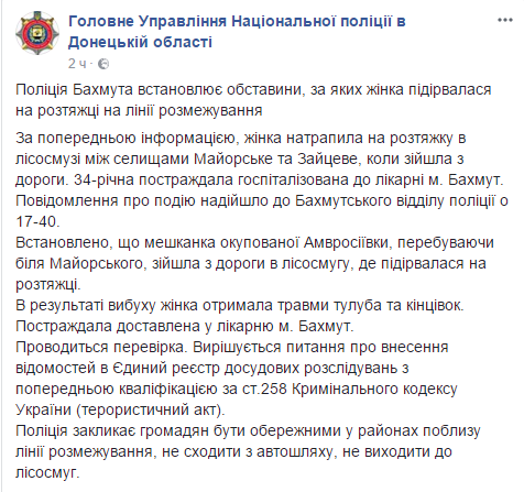 "По предварительной информации, женщина из неподконтрольной Украине Амбросиевки наткнулась на растяжку в лесополосе между поселками Майорское и Зайцево, когда сошла с дороги. 34-летнюю пострадавшую госпитализировали в больницу Бахмута", - говорится в сообщении.