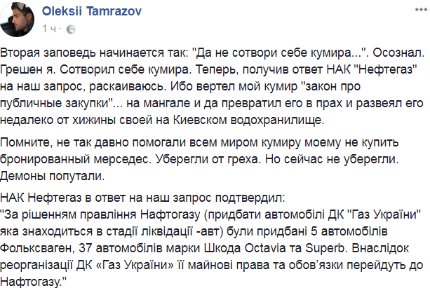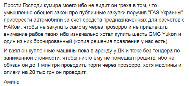 Журналист отмечает, что в "Нафтогазе" не видят ничего зазорного в том, что умышленно обошли закон про публичные закупки поручив "ГАЗ Украины" приобрести автомобили за счет средств предназначенных для расчетов с НАКом, чтобы не закупать самостоятельно и не привлекать внимание, так как изначально хотел купить шесть GMC Yukon и один из них бронированный.