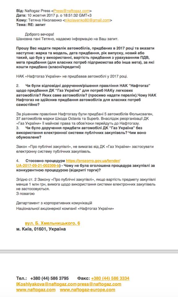 "По решению правления Нафтогаза (приобрести автомобили ДК "Газ Украины", которая находится в стадии ликвидации) были приобретены 5 автомобилей Фольксваген, 37 автомобилей марки Шкода Octavia и Superb. В результате реорганизации ДК "Газ Украины" ее имущественные права и обязанности перейдут к Нафтогазу".