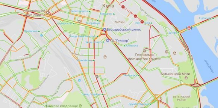 Затруднено движение Петровской алее, по улице Грушевского от стадиона "Динамо" им. В. Лобановского до Европейской площади, Бассейной, Большой Васильковской от площади Льва Толстого до бульвара Тараса Шевченко. Стоит Набережное шоссе и бульвар Леси Украинки.