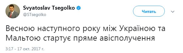 "Весной следующего года между Украиной и Мальтой стартует прямое авиасообщение", - заверил он.