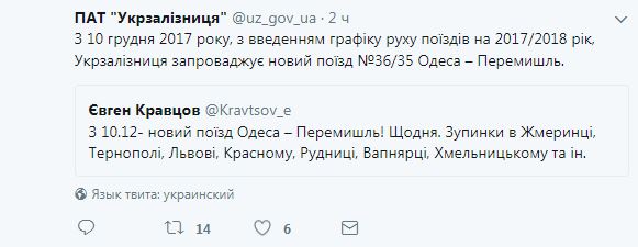 "С 10 декабря 2017 года "Укрзализныця" вводит новый поезд №36/35 Одесса–Перемышль", - говорится в сообщении ведомства.