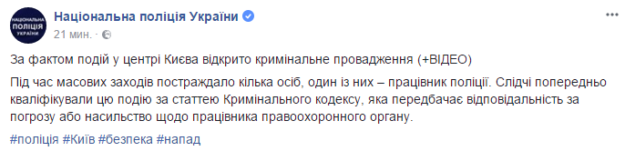 По факту  нанесения телесных повреждений во время акции протеста в центре Киева 17 октября открыто уголовное производство. Об этом сообщает Нацполиция в Facebook.