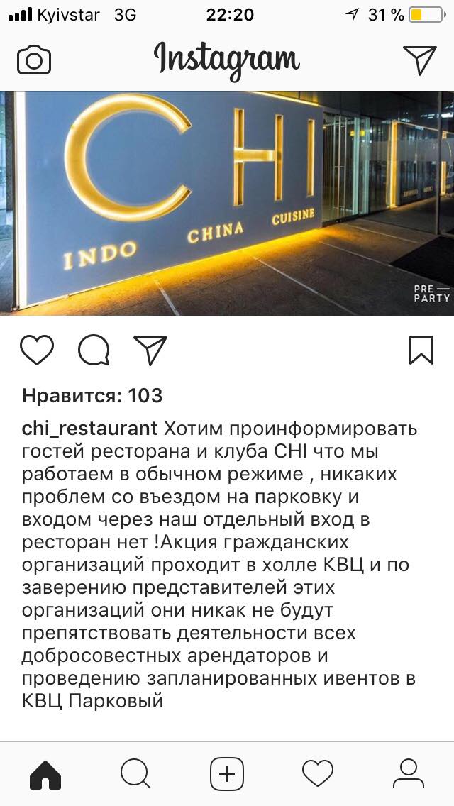 "Хотим проинформировать гостей ресторана и клуба CHI что мы работаем в обычном режиме, никаких проблем со въездом на парковку и входом через наш отдельный вход в ресторан нет! Акция гражданских организаций проходит в холле КВЦ и по заверению представителей этих организаций они никак не будут препятствовать деятельности всех добросовестных арендаторов и проведению запланированных ивентов в КВЦ Парковый", говорится в сообщении.