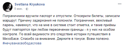 "Пограничники вручили паспорт и отпустили. Отксерили билеты, записали маршрут. Причину задержания не пояснили. Пограничник, вежливый парень, намекнул, что на мне в системе стоит отметка, и такие приёмы будут повторятся при любом пересечении границы - я у них на особом контроле. По всей видимости это следствие истории путешествия в МихоБасе. Спасибо за внимание. Держите в тонусе. Всем полезно", - написала Светлана Крюкова.