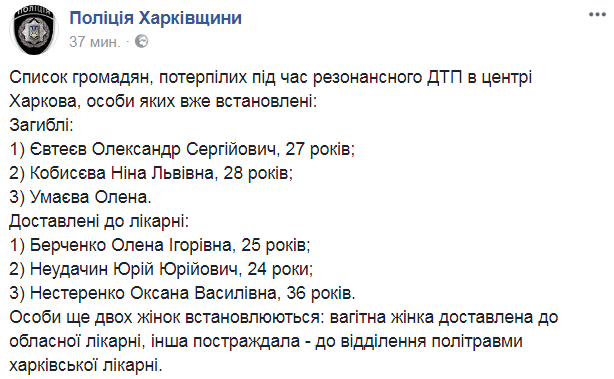 "Девушка-водитель Лексуса, который убил 6 людей в Харькове - студентка 3 курса социологического факультета университета им. Каразина, кафедра рекламы и пиара", - пишет у себя в ФБ харьковский юрист Алексей Романов.