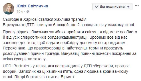 "Ужасная авария возле Пузатой Хаты на Сумской, 1. Сбит светофор. Пять трупов, 11 пострадавших, раненых скорая увезла. Полчаса назад. Лексус принял в бок удар Фольксвагена и перевернулся", - написал в соцсети Facebook очевидец аварии Ростислав Касьяненко.