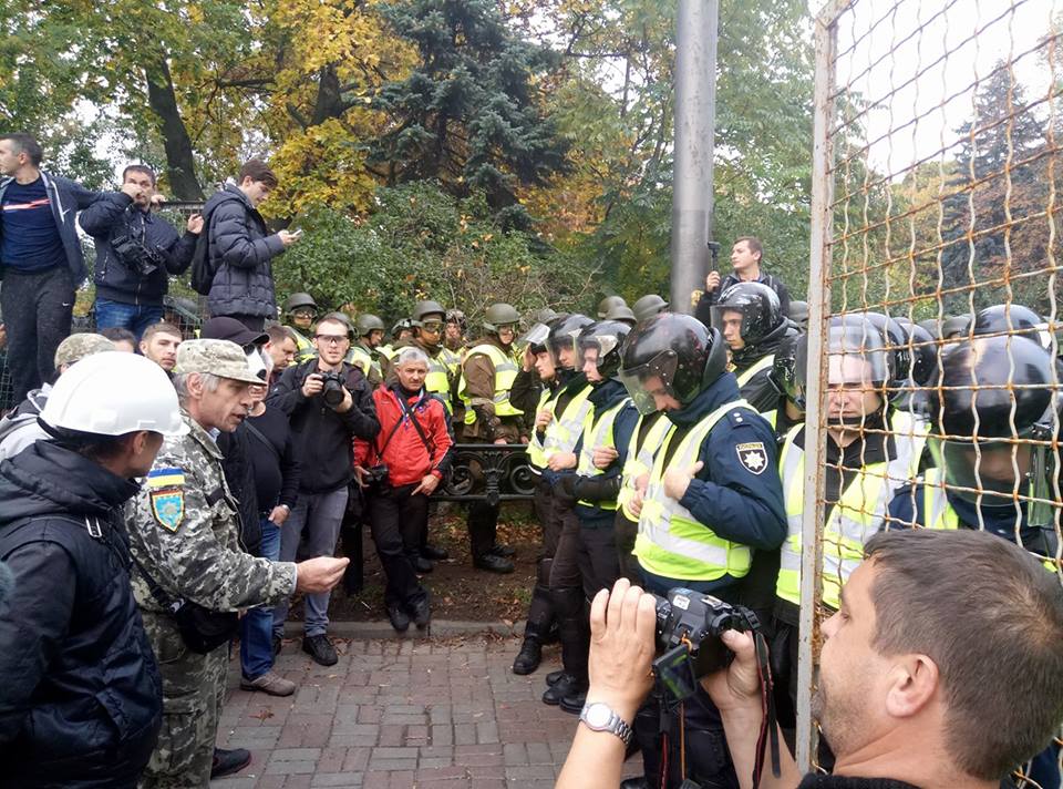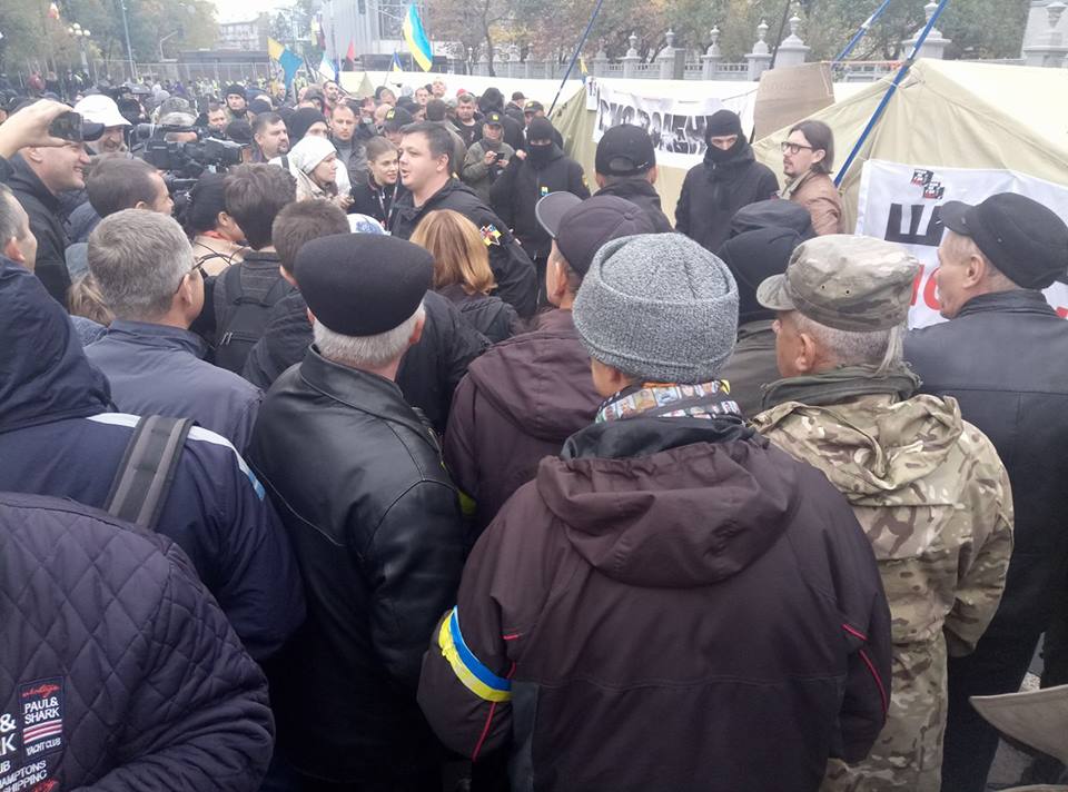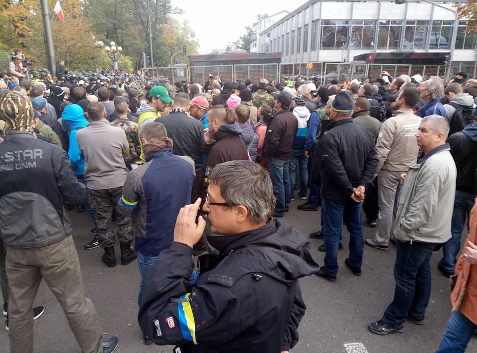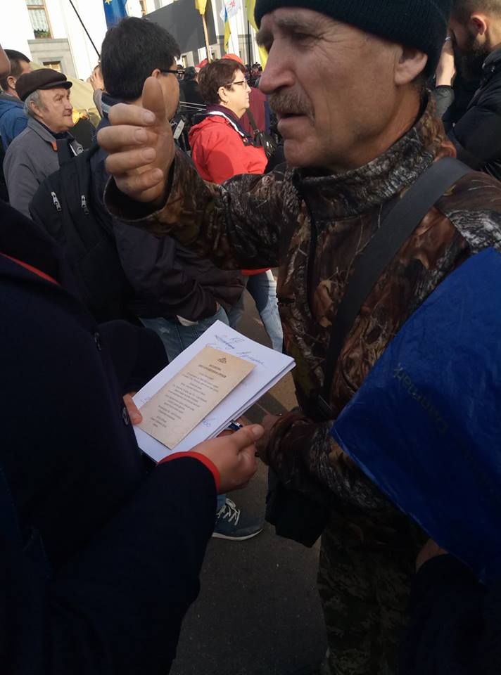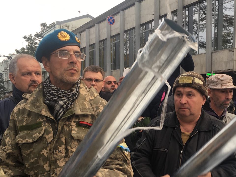 Один из них представился офицером батальона "Донбасс" с позывным Катана, родом с Прикарпатья. Он заявил, что ветераны АТО берут всю ответственность на себя. Требования протестующих - предателей Украины на нары, забрать власть у олигархов и равный закон для всех.