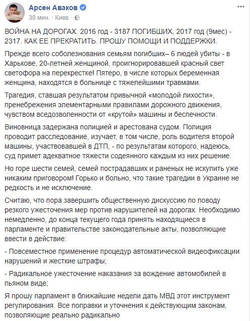 "Виновница задержана полицией и арестована судом. Полиция проводит расследование, изучает, в том числе, роль водителя второй машины, участвовавшей в ДТП, - по результатам которого, надеюсь, суд примет адекватное тяжести содеянного каждым из них решение", - сказал Аваков.