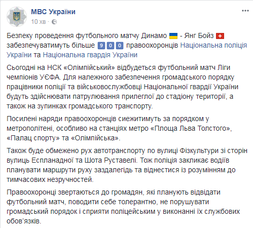 "Безопасность проведения футбольного матча "Динамо" и "ЯНГ Бойз"  будут обеспечивать более 900 правоохранителей из Национальной полиции Украины и Национальной гвардии Украины.