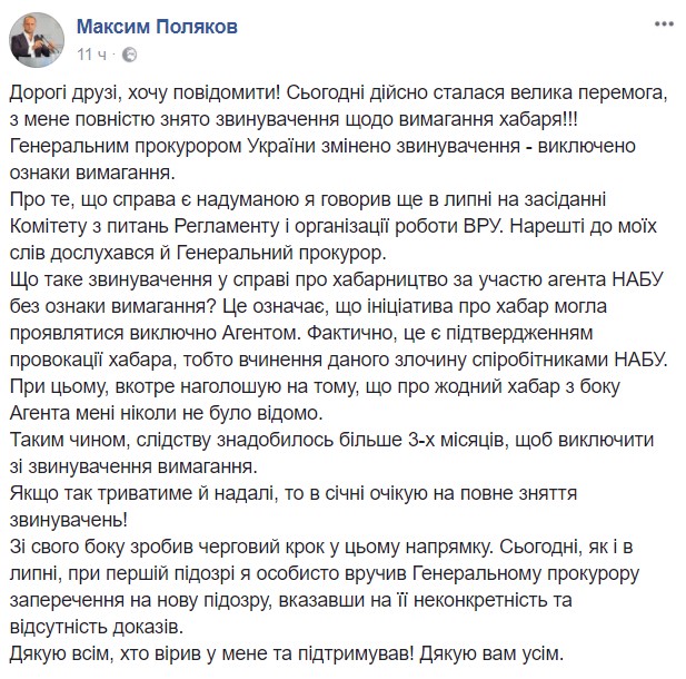 "Фактически, это и является подтверждением провокации взятки, то есть осуществления данного преступления сотрудниками НАБУ. При этом, в который раз настаиваю на том, что ни о какой взятке со стороны агента мне никогда не было известно", - считает Поляков.
