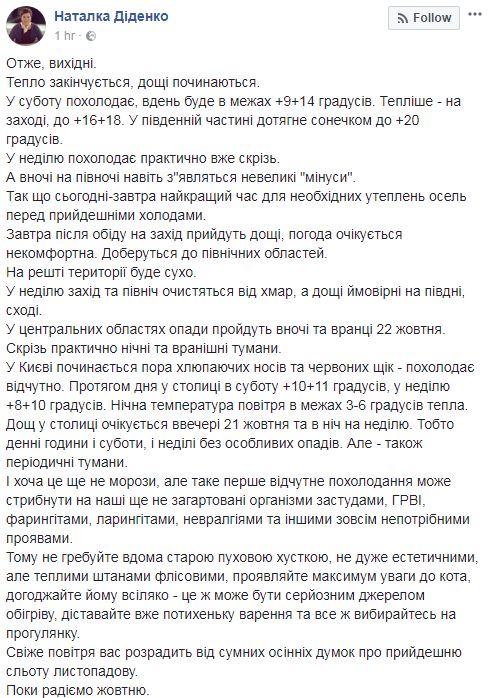 "В субботу похолодает, днем будет в пределах + 9 + 14 градусов. Теплее - на западе, до + 16 + 18. В южной части дотянет солнышком до +20 градусов. В воскресенье похолодает практически уже везде", - пишет она в Facebook.