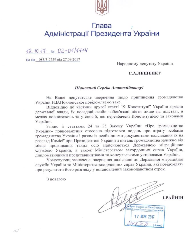 Из письма становится понятно, что ни Миграционная служба, ни Министерство иностранных, ни другие дипломатические учреждения не присылали президенту представление о лишении Поклонской украинского гражданства.