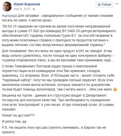 "08.04.15 задержан на горячем во время получения неправомерной выгоды в сумме 57 000 грн командир ВЧ 3466 58 центра ветеринарного обеспечения МО Украины полковник Гурин В.Г. за способствование в получении позитивных справок о пригодности продуктов питания к выдаче личному составу вооруженных формирований Украины", - говорится в сообщении.
