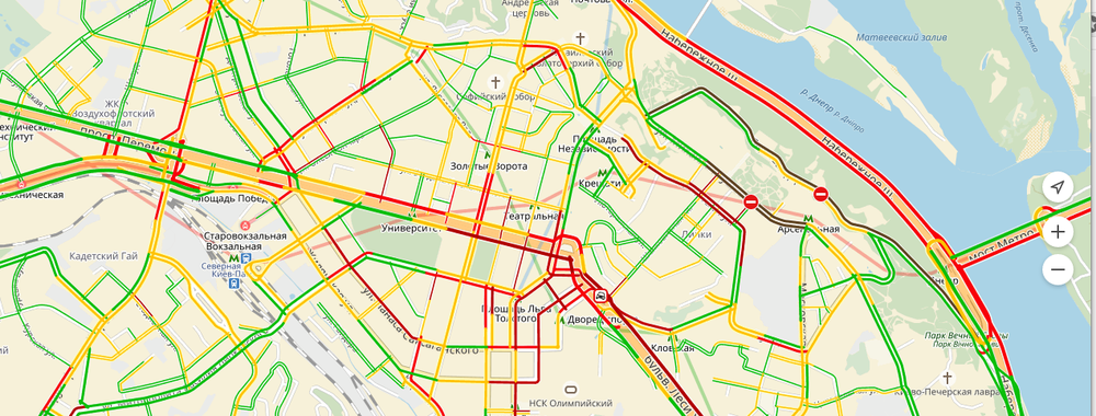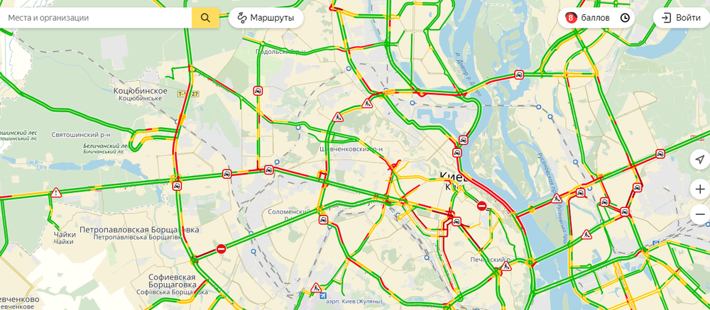 Пробка в обоих направлениях на Набережном шоссе, почти не едет часть улицы Саксаганского, проспект Победы труден для проезда в отрезке от Нивок до Святошино.