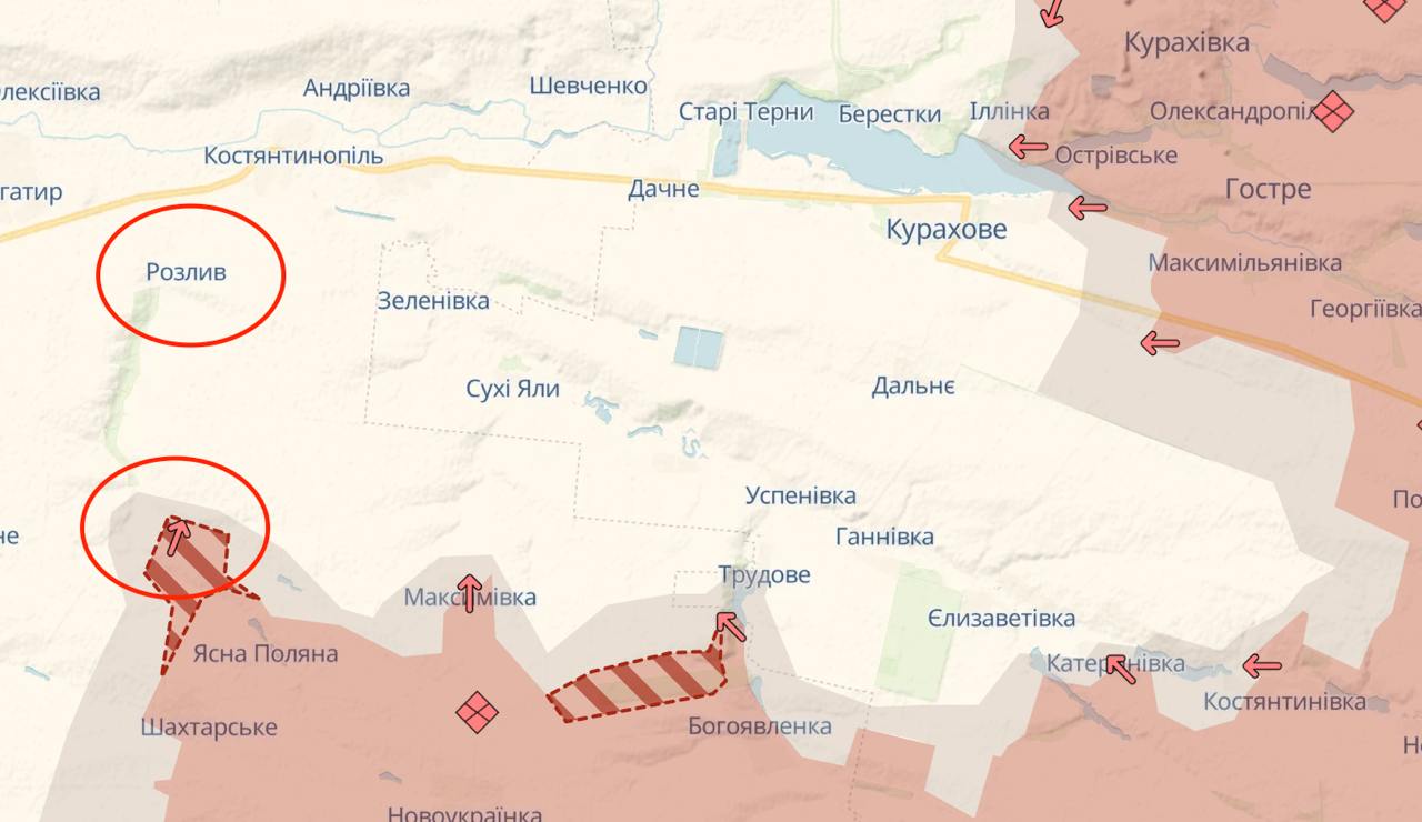 11.00 Армия РФ существенно продвинулась со стороны Ясной Поляны к селу Разлив, что возле трассы, ведущий с запада на Курахово, свидетельствует карта Deep State.